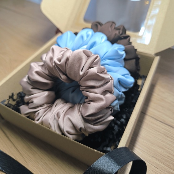 - 3 x mini scrunchies z grubszą gumką w kolorze: czekolada, błękit, beż