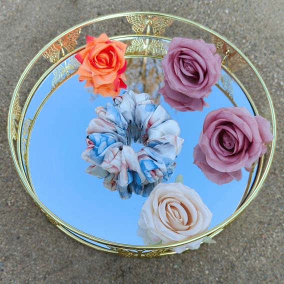 Prezentujemy MAXI scrunchies Kwiatki - idealne uzupełnienie Twojej kolekcji akcesoriów do włosów! Każda oferta obejmuje jedną gumkę do włosów scrunchies, wykonaną z wysokiej jakości satyny imitującej jedwab. Kolorystyka biało-niebieska z delikatnym akcentem różu sprawi, że Twoja fryzura nabierze wyjątkowego uroku.